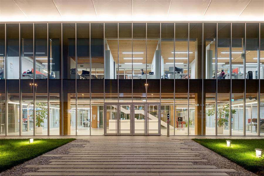 外立面为全玻璃幕墙,契合了Iperceramica开放、高效的企业文化,人们在室外就能欣赏到室内的工作环境,以欢迎的姿态迎接客户来体验建筑。