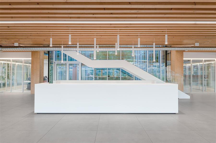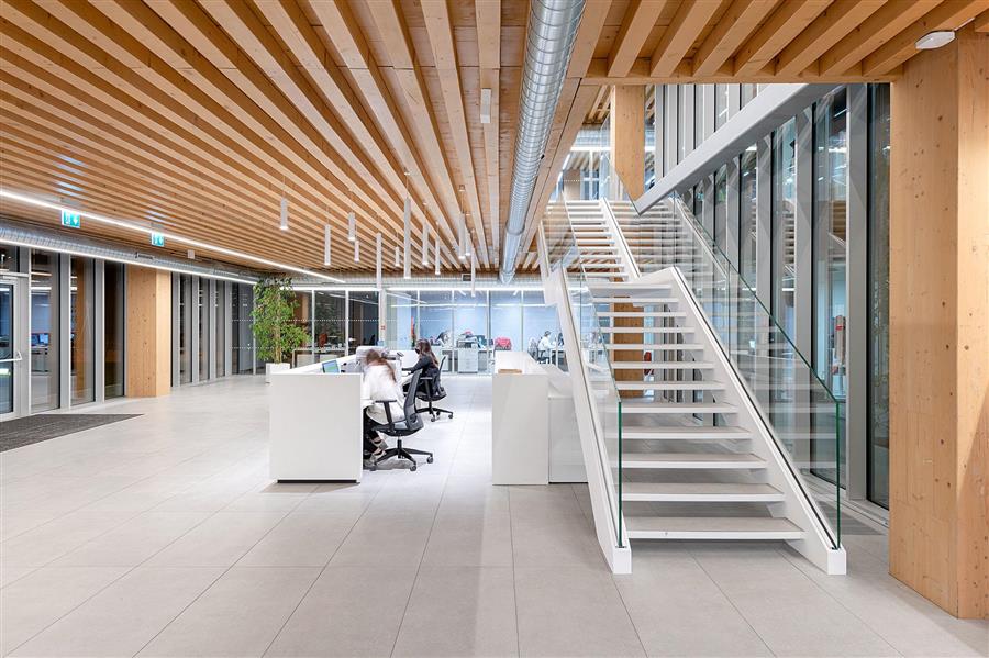 承重结构采用层压木材的预制构件,天花设置一系列约12 x 12 厘米的板条。通透的空间和木制结构清晰地展现在眼前,演绎木材的温暖美观。全玻璃的幕墙延伸至每个楼层,使自然光得以穿透建筑深处,创造高质量的室内环境。